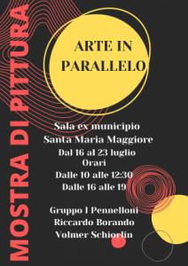 Santa Maria Maggiore - Da domenica 16 luglio a Santa Maria Maggiore (in Val Vigezzo) nelle sale dell’ex municipio si terrà la Mostra di Pittura “Arte in parallelo”. Esporranno le loro opere i Pittori: Riccardo Borando, Volmer Schiorlin, Roberto Minera, Angelo Ugazio, Mario Bianchi, Gabriele Vanini e Massimo Guarlotti. La mostra proseguirà sino a domenica 23 luglio con il seguente orario di apertura: dalle 10 alle 12.30 e dalle 16 alle 19. L’ingresso è libero. Nella mostra i vari pittori proporranno il meglio delle loro ultime opere, stimolando il visitatore a cogliere le varie forme di interpretazione delle realtà che ci circondano. Una pittura figurativa che, secondo la sensibilità di ogni pittore, assume aspetti diversi sia come utilizzo dei colori che come scelta dei soggetti appresentati.