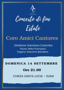 Suna - Il Coro Amici Cantores si esibisce in concerto per la Festa della B.V.M. Addolorata. Il Coro offre, in quel contesto, il suo tradizionale Concerto di Fine Estate. L'evento si riene domenica 14 settembre alle 21 nella Chiesa di Santa Lucia a Suna. Il concerto, diretto dal M° Damiano Colombo, vedrà la partecipazione di due musicisti: Mirko Pramparo al flauto e il giovane Giacomo Bandiera all'organo. "Con piacere - spiegano dal gruppo - il Coro Amici Cantores offre un momento di musica e riflessione all'interno di una celebrazione così sentita dalla comunità. Vi invitiamo a unirvi a noi per una serata speciale e a godere di un repertorio che spazia da brani classici a composizioni popolari, pensati per emozionare e coinvolgere il pubblico".