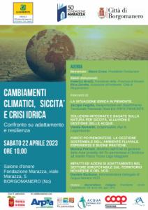 Borgomanero - “Cambiamenti climatici, siccità e crisi idrica – Confronto su adattamento e resilienza” è il titolo di un convegno che si terrà sabato 22 aprile, a partire dalle 10, nel salone d’onore di Villa Marazza. Sarà un attento “focus” sulle problematiche di grande attualità che stanno interessando il nostro mondo. Dopo il benvenuto del Presidente della Fondazione Marazza Marco Croce e i saluti istituzionali del Presidente della Provincia di Novara Federico Binatti e dell’Assessore all’Ambiente del Comune di Borgomanero Elisa Zanetta, il convegno entrerà nel vivo con una relazione di Jacopo Fogola, Arpa Piemonte, sulla “Situazione idrica in Piemonte”.