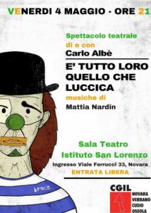 La sera del 4 maggio, a Novara, CGIL propone ‘E’ tutto loro quello che luccica’. Il protagonista del ‘romanzo teatrale’ di Carlo Albé, Lorenzo Guasti, racconta, per filo e per segno, al suo ostaggio, ex Presidente del Consiglio, tutto quello che è stato costretto a sopportare nel vano tentativo di trovare un posto di lavoro che non fosse una ‘nuova forma di schiavitù legalizzata’.
