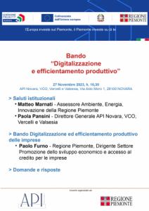 Novara - E’ per lunedì 27 novembre alle ore 10.30 l’appuntamento con Api e Regione Piemonte per la presentazione del Bando Regionale “Digitalizzazione e efficientamento produttivo”. Dopo i saluti istituzionali dell’Assessore Ambiente, Energia, Innovazione della Regione Piemonte Matteo Marnati e del Direttore Generale API Paola Pansini, il Paolo Furno - Dirigente Settore Promozione dello sviluppo economico e accesso al credito per le imprese della Regione Piemonte, procederà ad illustrare le opportunità offerte dal Bando. L’incontro si terrà in presenza presso la Sede API di Novara in Via Aldo Moro 1; in alternativa, potrà essere seguito in videoconferenza sulla Piattaforma Google Meet.