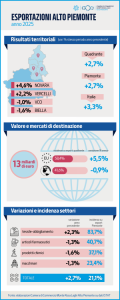 A livello territoriale, emergono performance eterogenee: Novara, che da sola copre il 53,1% del valore delle esportazioni del quadrante, guida la crescita con un +4,6%, Vercelli, con un'incidenza del 27,3% sul totale, registra un +2,2% mentre Biella, che rappresenta il 13,5% dell'export dell'area, subisce invece una flessione del -1,6%, e il Verbano Cusio Ossola (6,1% del totale) segna una contrazione del -1%. Il risultato complessivo dell'Alto Piemonte (+2,7%) è identico alla media regionale e poco al di sotto rispetto a quella nazionale (+3,3%). Le vendite all’estero del quadrante rappresentano il 21,1% del totale del Piemonte, quinta regione esportatrice d’Italia.
