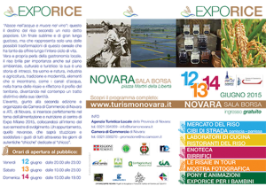 Novara - Dopo il grande successo dello scorso anno Expo Rice torna con la sua seconda edizione. Da venerdì 12 giugno, fino a domenica 14 si terrà una tre giorni interamente dedicata al riso da apprezzare in tutte le sue forme. L’evento, organizzato dalla Camera di Commercio di Novara e ATL di Novara, si inserisce nel tema dell’alimentazione e nutrizione al centro di Expo Milano 2015. Perla della gastronomia locale, il riso brilla anche sul piano ambientale, culturale e turistico: una storia di intrecci tra uomo e natura, tradizione e modernità, che Expo Rice racconterà attraverso una serie di iniziative: tour in bici e bus tra le risaie, animazioni per bambini, mostre fotografiche ma anche appuntamenti per i più golosi con degustazioni e laboratori culinari. Si parte venerdì 12 alle ore 19, presso la Sala Borsa di piazza Martiri, con l’inaugurazione della tre giorni. Per tutti gli appuntamenti leggi il programma completo.