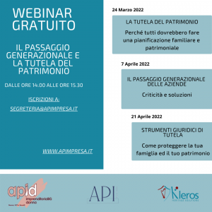 Novara - "Il Passaggio generazionale e la tutela del patrimonio": questo il titolo del ciclo di webinar gratuito organizzato dal Gruppo Donne dell'API Novara VCO e Vercelli che si terrà in modalità “aula virtuale sincrona” - Google meet dalle ore 14.00 alle ore 15,30 nelle seguenti date: 24 marzo, 7 e 21 aprile prossimi. Il ciclo di seminari si terrà in collaborazione con Massimo Doria - Presidente e fondatore di Kleros Srl, società dedicata alla tematica successoria e tutela patrimoniale ed ideatore della piattaforma Myarpa – ed è rivolto alle imprenditrici ed imprenditori del territorio finalizzati ad approfondire tutti gli aspetti patrimoniali, giuridici e di tutela patrimoniale inerenti.