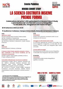 L’appuntamento si aprirà con i saluti istituzionali del Rettore UPO Menico Rizzi, del sindaco di Novara Alessandro Canelli e del direttore eletto del Dipartimento di Medicina traslazionale Massimiliano Panella. Alle 16:15, una sessione di approfondimento moderata dalla giornalista de La Stampa Barbara Cottavoz esplorerà passato, presente e futuro del Novara Cohort Study. Interverranno la professoressa Daniela Capello, associata di Biochimica clinica e biologia molecolare presso il Dipartimento di Medicina traslazionale dell’Università del Piemonte Orientale e responsabile scientifico di NCS – e il Team di Ricerca NCS, insieme ai rappresentanti e alle rappresentanti di importanti enti partner: il dottor Angelo Penna, Direttore Generale di ASL Novara, Stefano Scarpetta, Direttore Generale dell’Azienda ospedaliero-universitaria “Maggiore della Carità” di Novara, la dottoressa Benedetta Baraggioli, responsabile progetti culturali e strategici del Comune di Novara, il professor Davide Maggi, ordinario di Economia aziendale presso il Dipartimento di Studi per l’economia e l’impresa dell'Università del Piemonte Orientale e presidente della Fondazione Comunità Novarese, e Daniele Giaime, vicepresidente Centro Servizi per il Territorio Novara – VCO.