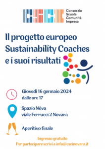 Novara - Come diventare “allenatori di sostenibilità”: lo spiegheranno giovedì 16 gennaio dalle ore 17 allo spazio Nòva (ex caserma Passalacqua, viale Ferrucci 2 a Novara) i project manager di Consorzio Scuola Comunità Impresa che insieme agli altri partner europei hanno realizzato il progetto “Sustainability Coaches” finanziato dal programma Erasmus. Ne verranno illustrati gli obiettivi, le attività e i risultati che includono un Manuale di Educazione allo Sviluppo Sostenibile, una piattaforma online con un percorso autodidattico in 6 moduli e un gioco educativo. Tranne quest’ultimo, le altre risorse sono già disponibili sul sito sustco.csciformazione.eu, tutte sono gratuite e accessibili a tutti.