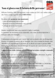 Novara - Continuano le vicende tristemente note dei lavoratori delle ex officine grafiche DeAgostini. La SLC CGIL e la Camera del Lavoro di Novara sostengono gli operai fin dalla chiusura dei cancelli e ancor più oggi, a quattro anni di distanza, non possono che unirsi ai lavoratori per far sentire la loro voce visto che nulla è cambiato e la disoccupazione terminerà entro qualche mese. Un incontro si terrà con i media locali in piazza del Duomo sabato 1 dicembre, dalle ore 17 alle 19 per il Presidio, durante il quale sarà possibile un confronto con gli operai coinvolti.