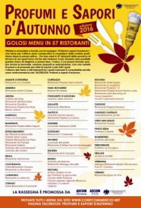 Novara - Ritorna anche nel 2016, per l’ottavo anno consecutivo, la rassegna gastronomica “Profumi e sapori d’autunno”, promossa da Confcommercio Alto Piemonte. Per due mesi, dal 1° ottobre al 30 novembre, in 57 ristoranti del Novarese e del Verbano Cusio Ossola si possono gustare menu di stagione a prezzo fisso. L’edizione 2016, che per la prima volta coinvolge anche la provincia del VCO, conferma il successo di un’iniziativa che valorizza la ristorazione locale e le materie prime del territorio, in un appetitoso percorso che si snoda dalla pianura alle colline ai laghi fino alle montagne delle valli ossolane.