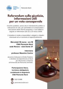 Novara - Con l’avvicinarsi del referendum costituzionale sulla riforma della magistratura, per il quale siamo chiamati alle urne il 22 e 23 marzo, CNA Piemonte Nord organizza un incontro pubblico di approfondimento. L’incontro si terrà: mercoledì 18 marzo alle ore 18 nella sede CNA in viale Dante 37 a Novara. Interverrà come relatore il professor Massimo Cavino, Ordinario di Istituzioni di Diritto Pubblico e Direttore del Dipartimento di Studi per l’Economia e l’Impresa all’Università del Piemonte Orientale.