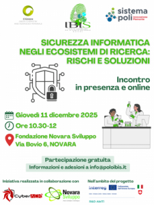 Novara - “Sicurezza informatica negli ecosistemi di ricerca: rischi e soluzioni” è il tema dell’incontro che si svolgerà giovedì 11 dicembre 2025 dalle ore 10:30 alle 12 presso la Fondazione Novara Sviluppo, in via Bovio 6 a Novara e in streaming online. Si tratta di un evento organizzato dal Consorzio Ibis con il patrocinio del Cluster CGreen e del Sistema Poli di Innovazione della Regione Piemonte. È realizzato in collaborazione con Cyber Ack e Fondazione Novara Sviluppo, nell'ambito del progetto Interreg Italia–Svizzera R&D Abiti (per informazioni sul progetto si può visitare la pagina https://rd-abiti.ibisprogetti.eu/).