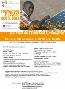 Da queste premesse nasce l’evento, ad ingresso gratuito, e la relativa mostra “FORMAZIONE E LAVORO CON IL SOLE” Italia e Senegal: due paesi a confronto sul tema delle energie alternative, che si svolgerà venerdì 30 novembre 2012, presso il CSF EnAIP di Oleggio, in viale Pagani 21.