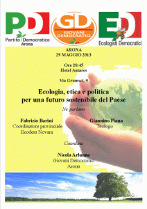 Arona - Dopo il successo dell’incontro di mercoledì 22 maggio a Novara dedicato al tema dell’energia questa settimana gli Ecologisti Democratici, in collaborazione con il circolo PD e GD di Arona, organizzano un’altra serata di approfondimento, informazione e formazione. Mercoledì 29 alle ore 20.45 presso l’Hotel Antares in Via Gramsci 9 ad Arona si terrà un dibattito pubblico su un tema di stretta attualità: «Ecologia, etica e politica, per un futuro sostenibile del Paese». Ne parleranno Giannino Piana, teologo, e Fabrizio Barini, coordinatore provinciale degli Ecologisti Democratici. Coordina Nicola Arlunno dei Giovani Democratici.