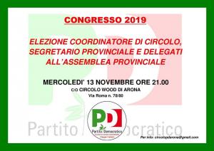 Arona - Riceviamo e pubblichiamo: "A seguito delle dimissioni presentate nel mese di giugno dal segretario provinciale del Partito Democratico di Novara, Sergio De Stasio, si è avviata anticipatamente una nuova fase congressuale che ha coinvolto tutti i Circoli della nostra provincia. A tal proposito si informano i cittadini che mercoledì 13 novembre 2019 alle ore 21.00, presso il circolo Wood di Arona, si svolgerà il congresso del Circolo PD di Arona-Dormelletto-Oleggio Castello in cui sarà presentata la ricandidatura alla segreteria di Circolo dell’attuale segretaria Virginia D’Angelo".
