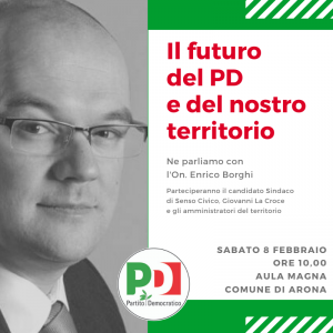 Arona - Sabato 8 febbraio alle ore 10 presso l'Aula Magna del Comune di Arona si svolgerà un evento organizzato dalla Federazione Provinciale del Partito Democratico di Novara in collaborazione con il Circolo PD di Arona-Dormelletto-Oleggio Castello con la presenza dell'On. Enrico Borghi e il candidato sindaco Giovanni La Croce.