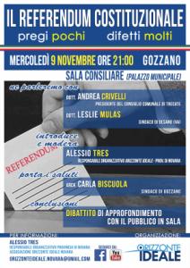 Gozzano - Il prossimo 9 novembre alle ore 21 prosegue anche a Gozzano – con un incontro pubblico nella Sala Consiliare del Palazzo Municipale – l’impegno di Orizzonte Ideale nell’approfondire i temi toccati dal referendum costituzionale su cui tutti gli italiani saranno chiamati alle urne il prossimo 4 dicembre. La serata sarà introdotta e moderata da Alessio Tres, responsabile organizzativo di Orizzonte Ideale nella provincia di Novara, il quale presenterà brevemente l’Associazione Orizzonte Ideale, che nel novarese sta realizzando una nutrita serie di incontri sul referendum: dopo un primo evento a Novara, si sono già svolti due appuntamenti a Cerano e Bellinzago e sono in programma altri appuntamenti a Borgomanero, Vicolungo e Trecate.