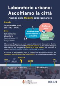 Il prossimo appuntamento è l’evento “Laboratorio Urbano: ascoltiamo la città” previsto per giovedì 20 novembre a partire dalle 17.30 nei locali comunali di Corso Cavour 22. L’obiettivo dell’incontro sarà l’ascolto della cittadinanza riguardo ai bisogni e alle criticità riscontrate nella mobilità quotidiana e nella fruizione degli spazi pubblici del territorio comunale. Tutti sono invitati a partecipare.