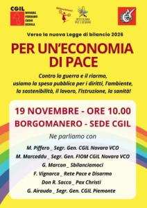 Borgomanero - S'intitola 'Per un'economia di pace' ed è una iniziativa promossa da Cgil Novara-Vco con Sbilanciamoci, Rete italiana Pace e disarmo e Fiom contro la guerra e il riarmo: "Usiamo la spesa pubblica per i diritti, l'ambiente, la sostenibilità, il lavoro, l'istruzione e la sanità!". L'appuntamento si tiene mercoledì 19 novembre alle ore 10 nella sede Cgil di Borgomanero in via Novara 55. Se ne parla con: M. Piffero - segretario generale Cgil Novara-Vco, M. Marceddu - segretario generale Fiom Cgil Novara-Vco, G. Marcon - Sbianciamoci, F. Vignarca - Rete Pace e disarmo; don R. Sacco - Pax Christi e G. Airaudo - segretario generale Cgil Piemonte.