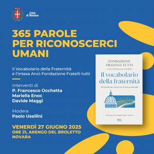 Novara - Venerdì 27 giugno alle ore 21 presso il salone Arengo del Broletto si svolgerà la presentazione di “365 parole per riconoscersi. Il vocabolario della fraternità e l’intesa Anci- Fondazione Fratelli Tutti”. Il Vocabolario della Fraternità, promosso dalla Fondazione Fratelli Tutti e curata dal Segretario Generale, Padre Francesco Occhetta, raccoglie 365 parole per riscoprire il senso della fraternità: parole capaci di modellare il mondo, contrastare l'indifferenza e promuovere la tutela della dignità umana. Ogni voce è affidata a un autore diverso, con contributi di 365 personalità di spicco, inclusi Premi Nobel e figure di calibro internazionale come Jody Williams, Graça Machel Mandela, Dimitrij Muratov, Giuliano Amato, Marco Damilano, Muhammad Yunus, Massimo Gramellini, Umberto Galimberti, Mariella Enoc, Paolo Benanti, Marta Cartabia, Silvia Avallone, Gemma Capra Calabresi e Stefano Lucchini.