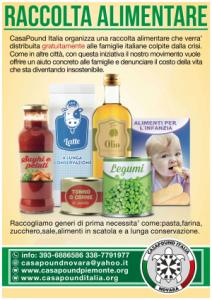 Novara - Riceviamo e pubblichiamo da Casa Pount Novara: "Dopo l'avvio della raccolta di materiale scolastico, annunciamo una nuova iniziativa solidale. CasaPound raccoglierà generi alimentari a lunga conservazione che verranno distribuiti mensilmente alle famiglie novaresi che versano in difficoltà economica. Troppo spesso vediamo le istituzioni abbandonare le famiglie italiane al loro destino - così Simone Gaiera, responsabile provinciale dell'associazione - e con questo gesto vogliamo dare un piccolo ma concreto contributo a quei nostri connazionali più colpiti dalla crisi. Siamo consapevoli che questa non sia una soluzione, ma contiamo di riuscire ad attivare un circolo virtuoso di solidarietà che rafforzi i legami comunitari all’interno della nostra città. Per questo chiediamo a tutti i cittadini che ne hanno la possibilità di darci una mano nella raccolta. Basta un piccolo gesto: pasta, pelati e legumi in scatola, tonno e carne in scatola, riso,olio, omogenizzati e prodotti per l’infanzia, tovaglioli di carta, sale, zucchero, prodotti per l’igiene, latte a lunga conservazione, caffè, biscotti, ecc. I recapiti ai quali fare riferimento, sia per donare che per ricevere aiuto, sono: - telefono 393-6886586 oppure 338-7791977; - indirizzo email casapoundnovara@yahoo.it. Aiutaci ad aiutare!"