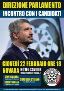 Novara - Giovedì 22 febbraio alle ore 18, evento di presentazione del programma politico di CasaPound Italia in vista delle elezioni del 4 marzo. Nostro ospite il segretario nazionale del movimento e candidato premier: Simone Di Stefano. Appuntamento presso l'Hotel Cavour, via S.Francesco D'Assisi 2 a Novara. #DirezioneParlamento