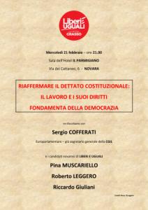 Novara - «Riaffermare il dettato costituzionale: Il lavoro e i suoi diritti fondamenta della democrazia» è il titolo della serata organizzata mercoledì 21 febbraio alle ore 21 all'Hotel Il Parmigiano in via dei Cattaneo 6 a Novara da Liberi e Uguali. Il tema verrà discusso da Sergio Cofferati, europarlamentare – già segretario generale della Cgil con i candidati novaresi di Liberi e Uguali alle elezioni politiche del 4 marzo Pina Muscariello, Roberto Leggero e Riccardo Giuliani.