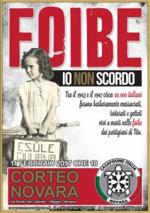 Novara - "Colpevoli di essere italiani - si legge in una nota di Casa Pound Novara - E per questo assassinati e poi dimenticati, ignorati, cancellati dalla storia: questi sono i martiri delle foibe. Ma l'identità di un popolo e di una nazione nata in trincea non si cancella col sangue, né con le censure sui libri di storia. Per questo, in occasione del 10 febbraio, tricolori alla mano, saremo tantissimi nelle piazze e nelle strade di tutta Italia, a ricordare le vittime di quel genocidio e il sacrificio degli esuli istriani e giuliano-dalmati costretti a lasciare le loro case dalla violenza comunista. CasaPound Italia non dimentica i 10mila martiri delle foibe, vittime del genocidio messo in atto dai partigiani di Tito negli anni a cavallo della seconda guerra mondiale, e, in occasione de Giorno del Ricordo, organizza iniziative in tutta Italia per ribadire che "la verità non può essere infoibata". Vi aspettiamo a Novara sabato 11 febbraio alle 18 - presso il Villaggio Dalmazia (via Monte San Gabriele, ritrovo parcheggio supermercato)".
