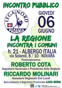 Novara - Invito ad un incontro pubblico da parte del segretario provinciale della Lega Nord, Luca Bona, e del responsabile provinciale per gli enti locali, Mauro Franzinelli. "Si svolgerá giovedì 6 giugno alle ore 21 presso l’Albergo Italia in via Solaroli 8/10 a Novara un incontro pubblico, organizzato dalla Lega Nord della provincia di Novara, sul tema: “La Regione incontra i Comuni”. L’incontro è finalizzato al confronto con i sindaci e gli amministratori della provincia, partendo dalla recente riforma sugli enti locali, approvata l’anno scorso in Regione Piemonte. La riforma prevede, fra l’altro, il riordino e l’accorpamento delle funzioni dei Comuni, che dovrà essere attuato entro il 2013. Sarà quindi l’occasione per fare il punto della situazione sull’attuazione della legge e per affrontare varie tematiche che toccano gli amministratori comunali, impegnati nella difesa dei propri cittadini tra molteplici difficoltà di vincoli e bilancio. Parteciperanno: il segretario nazionale della Lega Nord e presidente della Regione Roberto Cota, l’assessore regionale agli enti locali Riccardo Molinari, il segretario provinciale della Lega Nord e vice-presidente della Provincia Luca Bona e la responsabile del dipartimento federale “Federalismo-Autonomie-Comunità locali” Maria Piera Pastore".