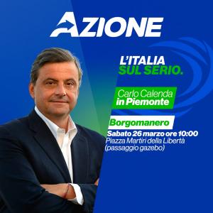 Novara - Borgomanero - Azione, che ha in Sergio De Stasio il suo rappresentante provinciale e regionale, organizza due incontri organizzati dalla Federazione che vedranno la partecipazione di: Giulia Pastorella (Vice Presidente Nazionale di Azione) mercoledi 23 marzo alle ore 18 presso le Grandi Volte in via dei Tornielli 9 a Novara; e il leader Carlo Calenda (Segretario nazionale di Azione) sabato 26 marzo alle ore 10 presso Piazza Martiri della Libertà a Borgomanero.
