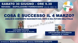 Novara - "Le elezioni del 4 marzo - si legge in una nota di Agorà sociale - hanno aperto una nuova fase per l'Italia, sottolineata anche dai risultati delle amministrative dei giorni scorsi. E’ doveroso creare un’occasione per analizzare e confrontarsi sull'attuale situazione politica, anche a fronte della gravissima crisi che sta attraversando il centrosinistra. Ne parliamo con: Cristopher Cepernich, Sociologo dei media e dei fenomeni politici all’Università di Torino e Direttore dell’Osservatorio sulla Comunicazione politica del dipartimento Culture Politiche e Società, Università di Torino; Luciano M. Fasano, Docente di Scienza politica e Istituzioni Politiche e Processi Decisionali, Università degli Studi di Milano; Augusto Ferrari, Assessore alle Politiche Sociali, della Famiglia e della Casa, Regione Piemonte. Modera: Giovanni Cerutti, Cultore della materia in Scienza politica presso l’Università degli studi di Milano".