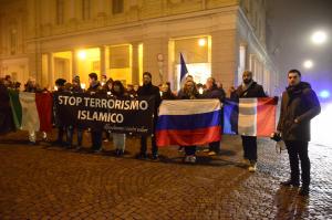 Novara - Striscione "Stop terrorismo islamico, difendiamo i nostri valori", tricolore italiano e bandiere di Francia e Russsia davanti ad un centinaio di persone che hanno sfilato in maniera ordinata e silenziosa per le vie del centro città da Piazza Puccini fino alla Prefettura per la fiaccolata organizzata dal Movimento Civico "Noi X Novara" e Lega Nord senza bandiere di partito e senza simboli politici. "Volevamo dare un segnale perché non basta più il raccoglimento e la solidarietà alle vittime degli attentati ma serve di più. Anche a livello locale un'amministrazione può fare qualcosa in più, atti concreti anche sul territorio, a partire da più controlli a moschee e centri culturali, alle attività commerciali, fino alle presenze sul territorio" ha commentato Alessandro Canelli.