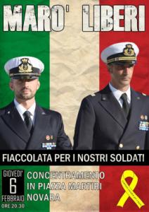 Novara - E' stata rinviata a giovedì 6 febbraio alle 20,30 con ritrovo in Piazza Martiri, la fiaccolata di solidarietà per i due Marò in programma per lunedì 3 febbraio. Il "Comitato Tricolore Novara - per i Marò" ha deciso di spostare l'iniziativa per motivi metereologici - lo comunicano con una nota stampa i portavoce Marco Aggradi, Ivan De Grandis, Mattia Marinò e Francesca Riga.