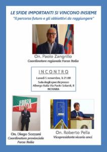 Novara - "Ho il piacere di invitarvi - afferma l'on. Diego Sozzani, coordinatore provinciale di Forza Italia - all'incontro che si terrà lunedì 5 novembre alle ore 21, nella sala degli specchi dell'Albergo Italia di Novara. Assieme al coordinatore regionale di Forza Itala, on. Paolo Zangrillo, e al vicepresidente vicario di ANCI nazionale, on. Roberto Pella, faremo il punto sul tema infrastrutture in Piemonte. Parleremo di opere incompiute e di progetti futuri, con un'attenzione particolare a temi di stretta attualità come TAV e Terzo Valico. In particolare, è di questi giorni la notizia dell'approvazione di un nostro importante Odg relativo all'inclusione dei poli logistici di Novara e Mortara nella zona logistica semplificata per il rilancio del porto di Genova".