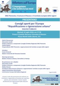 Novara - La campagna “Reflecting on Europe” torna a far tappa in Piemonte, questa volta a Novara, con un evento sul tema “Riqualificazione e rigenerazione urbana”. L’evento, organizzato da ANCI Piemonte e dalla Rappresentanza Italiana di Milano della Commissione Europea, con il patrocinio del Comitato europeo delle Regioni e in collaborazione con il Comune di Novara, si terrà al Castello Visconteo Sforzesco di Novara il prossimo 10 luglio. Interverranno il sindaco del capoluogo, Alessandro Canelli, il Magnifico Rettore dell’Università del Piemonte Orientale, Cesare Emanuel, il Presidente della Provincia di Novara, Matteo Besozzi, il vicepresidente di ANCI Piemonte e rappresentante del Comitato europeo delle Regioni, Andrea Ballarè, e il direttore generale della Commissione Europea Anguel Konstantinov Beremlivsky. Modererà l’incontro Barbara Cottavoz, giornalista del quotidiano La Stampa.
