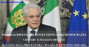 Novara - La Federazione del PD di Novara, nel voler esprime la propria solidarietà al Presidente Mattarella, organizza per Giovedì 31 maggio alle ore 17.30 un presidio in difesa delle Istituzioni e della Democrazia davanti alla Prefettura in Piazza Matteotti a Novara. Chiama alla partecipazione tutte le forze democratiche del territorio di Novara