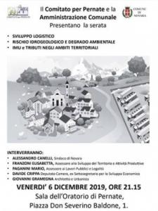 Pernate - Incontro pubblico per parlare del presente e, soprattutto, del futuro di Pernate. L'organizza il Comitato per Pernate e l'Amministrazione comunale di Novara la sera di venerdì 6 dicembre alle ore 21 nella sala dell'oratorio in via don Severino Baldone 1. Nel corso dell'appuntamento si parlerà di: sviluppo logistico, rischio idrogeologico e degrado ambientale, Imu e tributi negli ambiti territoriali. A trattare questi temi ci saranno: il sindaco di Novara Alessandro Canelli, l'assessore allo Sviluppo del territorio e alle Attività produttive Elisabetta Franzoni, l'assessore ai Lavori pubblici e alla Legalità Mario Paganini, l'ex Sottosegretario allo Sviluppo economico, on. Diego Crippa e l'architetto e urbanista Giovanni Gramegna.