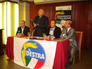 Novara - Sabato 8 settembre il segretario nazionale de La Destra Francesco Storace ha fatto tappa a Novara per illustrare ai giornalisti le linee programmatiche del partito in vista delle Elezioni politiche del 2013; in particolare Storace si è soffermato sull'importanza che riveste la sovranità popolare: a tal proposito è imprescindibile che i cittadini possano eleggere i propri rappresentanti in Parlamento, quindi va riformata l'attuale legge elettorale che non garantisce questo diritto. Dopo un intervento del rappresentante di Gioventù Italiana Ivan De Grandis, hanno portato il loro contributo i segretari provinciale e regionale del partito Franco Caserta e Giuseppe Lonero ed il consigliere provinciale Alessandro Albanese (unico consigliere provinciale de La Destra in Piemonte).