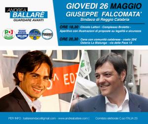 Novara - Il comitato elettorale Ballarè Sindaco organizza un incontro con il sindaco di Reggio Calabria Giuseppe Falcomatà, che sarà a Novara giovedì 26 maggio per sostenere proprio il collega novarese. Alle 18.30 Conferenza stampa - aperitivo al Circolo dei Lettori per presentare le proposte del centrosinistra su legalità e sicurezza. All'appuntamento con la stampa seguirà una cena con la comunità dei novaresi di origine calabrese presso l'osteria La Bislunga in via della Pace 13 (costo 20 euro cad.).