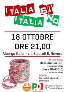 Novara - "I Giovani Democratici del Circolo di Novara - si legge in una nota stampa - e il Partito Democratico della Provincia di Novara hanno organizzato per martedì 18 ottobre, alle ore 21, il primo confronto in città tra le ragioni del Sì e quelle del No riguardanti il referendum costituzionale da votarsi il 4 dicembre. I relatori dell’evento saranno due costituzionalisti, Massimo Cavino (UPO) e Luca Imarisio (UniTO). Il moderatore della serata sarà invece il Giovane Democratico Mattia Colli Vignarelli. Sarà una bella occasione per mettere al centro del dibattito la riforma: quali i suoi pregi? Quali i suoi difetti? Quale la portata e i suoi effetti sulla vita democratica del nostro Paese? I Giovani Democratici ed il Partito Democratico si stanno già confrontando al loro interno su questo argomento, e sono orgogliosi di proporre alla città di Novara quest’occasione di confronto nel merito delle questioni. Ciò a dimostrazione del fatto che il Partito Democratico e i Giovani Democratici sono una comunità aperta al dialogo, inclusiva e capace di confrontarsi su temi cruciali come questo. Lo dimostrano i confronti promossi in questi mesi in tutt’Italia; siamo infatti anche noi convinti della necessità di valorizzare gli spunti di riflessione di ciascuno, dentro e fuori dal PD. Per questo invitiamo tutta la cittadinanza a partecipare. L’appuntamento è fissato per martedì alle ore 21 presso l’albergo Italia".