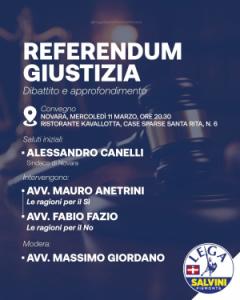 Novara - Mercoledì 11 marzo a partire dalle ore 20.30 si tiene un dibattivo e approfondimento promosso dalla Lega su "Referendum giustizia" al ristorante "Kavallotta" via case sparse Santa Rita 6. Vi partecipano il sindaco di Novara Alessandro Canelli per i saluti iniziali e gli avvocati Mauro Anetrini (le ragioni del Sì) e Fabio Fazio (le ragioni del No); modera l'avv. Massimo Giordano che è il segretario provinciale del Carroccio.