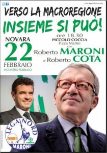 Novara - A poche ore dal 'solenzio elettorale' che scatterà alla mezzanotte tra venerdì 22 e sabato 23 febbraio, il candidato governatore della Lombardia e oggi leader della Lega Nord, Roberto Maroni, farà tappa a Novara. L'ex ministro degli Interni è atteso alle 18.30 al Piccolo Coccia (ingresso in piazza Martiri) per un convegno sul tema "Verso la macroregione - Insieme si può!". Ad accogliere Maroni ci sarà il governatore del Piemonte e segretario nazionale del Caccoccio, Roberto Cota. L'incontro è pubblico.