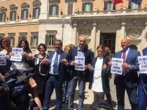 "Siamo con una catena in piazza a simboleggiare la condizione degli italiani con la legge sulla legittima difesa approvata dalla Camera. Noi vogliamo uno Stato vicino alle vittime e non ai criminali. Per noi la difesa è sempre legittima". Lo afferma Giorgia Meloni, leader di fratelli d'Italia che insieme ai parlamentari del suo partito si è simbolicamente incatenata in piazza Montecitorio dopo l'ok dell'aula alla legge sulla legittima difesa su cui Fdi si è espressa in modo contrario. Oltre alla catena, i parlamentati tenevano in mano un cartello con su scritto 'la difesa è sempre legittima'.