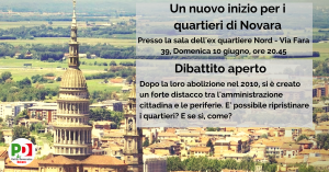 Novara - Domenica 10 giugno a partire dalle ore 20.45, presso l'ex sede di quartiere Nord, in via Fara 39, ci sarà un dibattito organizzato dal Circolo del Partito Democratico di Novara. Il dibattito avrà ad oggetto la possibilità di far rinascere i quartieri, magari sul modello di altre realtà simili a Novara, per agevolare la partecipazione dei cittadini alle scelte dell'amministrazione comunale. Tutti i cittadini presenti potranno partecipare al dibattito, esprimendo il loro parere. Tra i relatori ci sarà il capogruppo Pd in Consiglio comunale (ed ex sindaco) Andrea Ballarè.