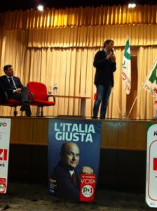 La parola infine a Renzi, capace di intercalare un concetto molto serio ad una battuta di puro spirito. Comincia dicendo: "Io e Andrea (Ballarè) siamo ormai una coppia di fatto... Le elezioni sono importantissime davvero e il nostro comandamento dev'essere quello insegnatoci da don Lorenzo Milani negli anni '50: I care, mi prendo cura di te. L'Unione europea mette la parola su tutto, su come devono essere 'fatti' i formaggi, i salumi, le bontà gastronomiche, su spread e altre faccende di carattere finanziario, ma trovo assurdo che non abbia detto una sola parola per i drammi che si stanno vivendo in Siria e di recente in Tunisia, dove il capo dell'opposizione è stato assassinato. I padri fondatori dell'Europa pensavano ad un continente unito non all'euro. Perché non si istituisce un servizio civile unico per tutta Europa? Sono qui anche per sottolineare quanto la Politica sia bella, perché infonde valori e dà speranza: questa è la sfida più importante che abbiamo di fronte. Io ad esempio ho perso le primarie, ma come avevo detto mesi fa non vado a Roma, perché non ho contrattato la mia sconfitta con una poltrona a sottosegretario, ministro o presidente di una delle due Camere. Questo è rigore etico. Il compito di chi vince le elezioni dev'essere quello di governare; non deve più succedere come è stato con Prodi che viene mandato anzitempo a casa proprio dalla sua stessa maggioranza. La politica è solo pulita, se è sporca è corruzione. Non è politica nemmeno fare false e improponibili promesse: non siate dei numerini che si possono comprare come al supermercato o non crediate alle occasioni del venditore di pentole di turno... Sono poi convinto che noi vinceremo se non parleremo male dei nostri avversari, ma punteremo sulla concretezza per dare un'immagine e una visione diversa del nostro Paese e del suo futuro. Questo lo dobbiamo ai nostri figli. Non c'è nessuna poltrona che vale di più della tua faccia e ricordiamoci quel che diceva Montanelli: il giudice più severo è il tuo specchio ogni volta che ti vedi. Basta sabbie mobili, basta burocratismi e sì alla governabilità. Lo stesso Grillo è come un orologio rotto che due volte al giorno dà l'ora giusta: ha ragione quando parla di free Internet e di liste pulite ed è stato bravo e capace di raggruppare le forze più arrabbiate del Paese. Ora la scelta sta a voi: tra 15 giorni si vota, vogliamo regalare una speranza e l'entusiasmo all'Italia? Non dobbiamo avere né vergogna e nemmeno paura di andare a prendere i voti di chi sino a ieri ha votato il centrodestra ed oggi si dice deluso dalla sua politica: se ci votiamo sempre tra di noi siamo destinati a perdere di nuovo le elezioni. Io ho massimo rispetto per Bersani, sarà il mio Presidente del Consiglio: talmente lo appoggio nella sua campagna elettorale che sono andato a vedere con lui Juventus-Fiorentina! Ma la prossima volta chiedo la rivincita a calcio in costume o alla Maratona...". Risate e applausi dal pubblico, qualche foto ricordo e via verso la sua Firenze: domani è lunedì e lo aspetta Palazzo Vecchio.