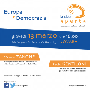 Novara - Prima iniziativa pubblica dell'associazione "La città aperta": "Europa e Democrazia" che si terrà alle 18 di giovedì 13 marzo nella sala congressi dell' Est Sesia in via Negroni 7 a Novara. L' iniziativa avrà il seguente programma: presentazione associazione e serata da parte di Giuseppe Genoni, coordinatore "La città aperta" (gli altri soci fondatori sono Michele Savino e Maurizio La Masa); interventi di Valerio Zanone, già segretario Partito Liberale Italiano e più volte Ministro, e Paolo Gentiloni, deputato PD e già Ministro delle comunicazioni. Durante il convegno ci si potrà iscrivere all' associazione e ricevere materiale informativo.