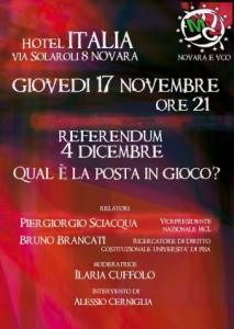Novara - Giovedì 17 novembre alle ore 21 presso il Salone degli Specchi dell'Albergo Italia, in via Solaroli 8 a Novara,MCL (Movimento Cristiano Lavoratori) Novara e Vco organizza un incontro pubblico sulla proposta di riforma costituzionale oggetto del prossimo referendum confermativo del 4 dicembre: “Referendum 4 dicembre – Qual è la posta in gioco?”. La serata avrà come relatori Bruno Brancati, ricercatore di Diritto costituzionale dell'Università Sant'Anna di Pisa, e Piergiorgio Sciacqua, vicepresidente nazionale Mcl. Modera Ilaria Cuffolo. L’intento degli organizzatori è di offrire un’occasione di informazione e confronto sul contenuto del referendum e sulle conseguenze del suo esito, sia nel caso prevalga il sì, sia che vinca il no. Tutti i cittadini sono invitati a partecipare, l'ingresso è libero e gratuito. Per informazioni si può scrivere a unioneterritoriale.no-vco@mcl.itoppure telefonare al 331 305 8213.