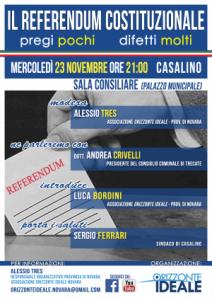 Casalino - Il prossimo 23 novembre alle ore 21 prosegue anche a Casalino – con un incontro pubblico nella Sala Consiliare del Palazzo Municipale – l’impegno di Orizzonte Ideale nell’approfondire i temi toccati dal referendum costituzionale su cui tutti gli italiani saranno chiamati alle urne il prossimo 4 dicembre. Alla serata –introdotta daLuca Bordinie moderata da Alessio Tres, responsabile organizzativo di Orizzonte Ideale nella provincia di Novara – parteciperà Andrea Crivelli, Presidente del Consiglio Comunale di Trecate,e porterà un saluto il Sindaco di Casalino Sergio Ferrari. Non si tratta di un convegno ma di un incontro di approfondimento, aperto al dialogo e al dibattito con il pubblico presente in sala. l’Associazione Orizzonte Ideale sta infatti realizzando nel novarese una nutrita serie di incontri di approfondimento: dopo un primo evento a Novara, sono infatti stati organizzati appuntamenti aBorgomanero, Bellinzago, Cerano, Gozzano e vi sarà una serata conclusiva a Trecate.