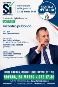 L’incontro sarà moderato dall’avvocato Giovanni Porzio e vedrà i contributi tecnici dell’avvocato Federico Celano, Presidente della Camera Penale di Novara, e del giornalista Giovanni Maria Jacobazzi. L’evento si concluderà con l’intervento del Sottosegretario alla Giustizia Andrea Delmastro Delle Vedove, che illustrerà le ragioni politiche del SÌ, i contenuti concreti della riforma e le sue implicazioni per i cittadini, sottolineando come il referendum rappresenti un’occasione storica per restituire la parola agli italiani e responsabilità al sistema giudiziario.