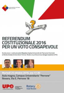 Novara - Università del Piemonte Orientale e Rotary Club incrociano le proprie traiettorie per offrire alla cittadinanza di Novara e del Piemonte orientale un'occasione di dibattito pubblico in vista del referendum costituzionale fissato per il 4 dicembre 2016. Il 25 ottobre 2016, alle ore 17.30 presso l'aula magna del Complesso Universitario "Perrone", in Via Perrone 18 a Novara, si terrà l'incontro sul tema "Referendum costituzionale 2016: per un voto consapevole". L'incontro è stato fortemente voluto dall'attuale presidente del Rotary Club Novara, professoressa Fabiola Sinigaglia, e dal direttore del Dipartimento di Studi per l'economia e l'impresa dell'UPO professoressa Eliana Baici. Le ragioni del Sì e quelle del No verranno esplorate dai due costituzionalisti Massimo Cavino (Università del Piemonte Orientale) ed Enrico Grosso (Università di Torino), moderati dalla professoressa del DiSEI Giorgia Casalone. L'incontro è aperto al pubblico.