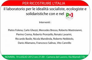 Novara - La Camera del Lavoro di Novara in via Mameli 7/b ospita giovedì 19 luglio alle 21 un convegno dal titolo "Per ricostruire l'Italia - Il laboratorio per le idealità socialiste, ecologiste e solidaristiche con e nel Pd". Interverranno: Pietro Folena, Carlo Ghezzi, Mercedes Bresso, Roberto Mastroianni, Pierino Crema, Roberto Pronzello, Renato Lavarini, Riccardo Basile, Nicola Mandirola, Roberto Nebbiolo, Dario Allamano, Francesco Salinas e Vito Cannillo.