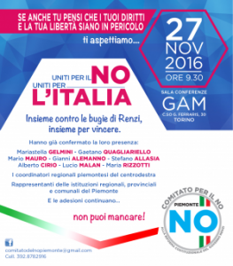 Novara - "Il 4 dicembre - spiega il consigliere regionale e coordinatore provinciale di Forza Italia, Diego Sozzani - giorno in cui andremo a votare per il Referendum costituzionale, si avvicina con una campagna elettorale da parte del Presidente del Consiglio e del fronte del SI' senza alcun rispetto istituzionale. Presenza televisiva e radiofonica senza alcun rispetto della par condicio, materiale elettorale inserito nelle schede dei nostri concittadini all’estero, spot per invitare ad andare a votare che appare come uno spot per il SI. A tutto questo e ad una Riforma costituzionale che garantisce ad una minoranza di governare il Paese, eleggere 1.500 vertici fra i quali il Presidente della Repubblica, i vertici del CSM, della Corte Costituzionale e della RAI, dobbiamo dire un forte NO. Per questo motivo per domenica 27 novembre abbiamo organizzato come Comitato per il NO Piemonte un’iniziativa estremamente importante per la qualità degli ospiti e perché mette insieme tutto il centro-destra: Forza Italia, Lega Nord, Fratelli d’Italia ma anche significativi esponenti nazionali del centrodestra che oggi lavorano per costruire un centrodestra quanto più ampio e inclusivo possibile. Insieme agli esponenti nazionali vi saranno i parlamentari piemontesi, i consiglieri regionali, i presidenti delle Province e i sindaci a dimostrazione di come -unito- il centrodestra possa essere una forza di governo locale e tornare ad esserlo a livello regionale e nazionale. Per questo la tua partecipazione e quella degli amici a cui vorrai estendere questo invito è fondamentale. Insieme diremo un forte NO a Matteo Renzi e metteremo le basi per la costruzione di un centrodestra unito".